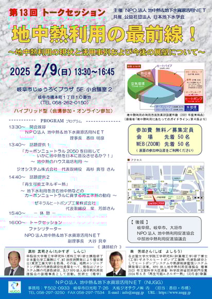 2050年カーボンニュートラル実現のためにはあらゆる技術の導入が不可欠です。今回は、メインテーマ「地中熱利用の最前線!」と題し、地球温暖化対策の有効な再エネ技術のひとつである地中熱利用の普及に向け、最新の動向や技術及び課題などについてトークセッションを繰り広げます。多数の方のご参加をお待ちしております。