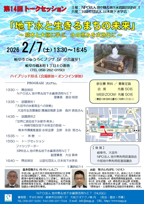 今回のトークセッションでは、この地下水の活用と保全に先進的に取り組み、地下水とともに生きるまち大垣市及び熊本市をお招きし、その先駆的な取組事例や成果、課題などについて紹介いただき、地下水とともに生きるまちの未来についてトークセッションを繰り広げます。多数の方のご参加をお待ちしております。